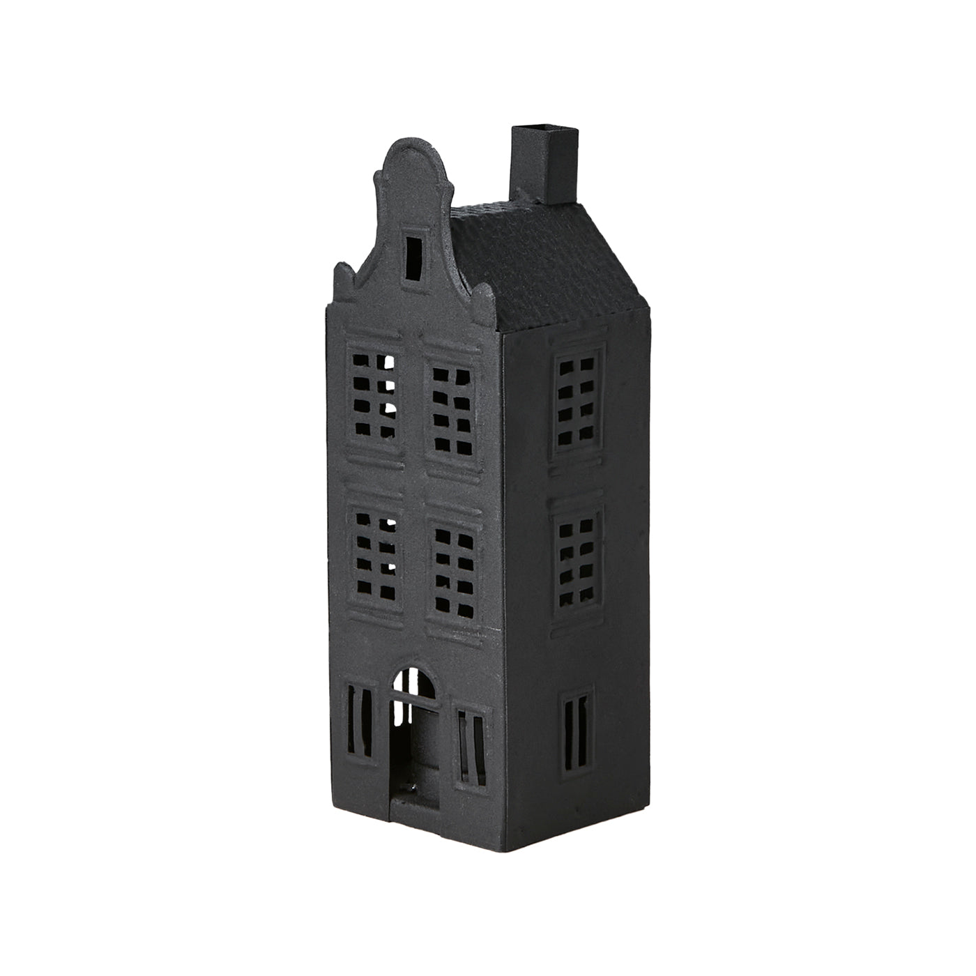 Esta casa en negro mate con estilo envejecido presenta hermosas ventanas y puertas perforadas. Está pensada para colocar una vela tealight en su interior, permitiendo que la luz se difunda suavemente por sus aberturas y cree un ambiente cálido y acogedor. También puedes optar por añadir una guirnalda de luces o utilizar luces a pilas para iluminarla según prefieras.
