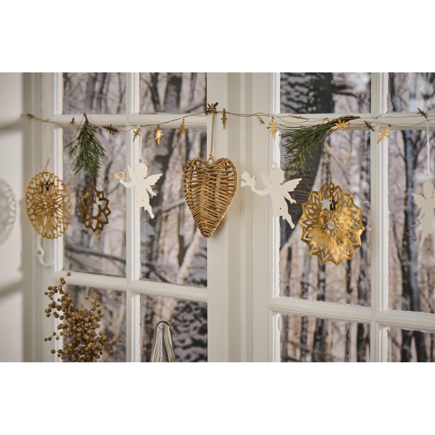 Dale un toque de gracia a tu espacio festivo con esta linda cadena de estrellas de latón. En sus extremos tiene un lazo para colgar de manera sencilla. Úsala para decorar tu mesa festiva, o colócala en una ventana o puerta para dar ese toque especial.