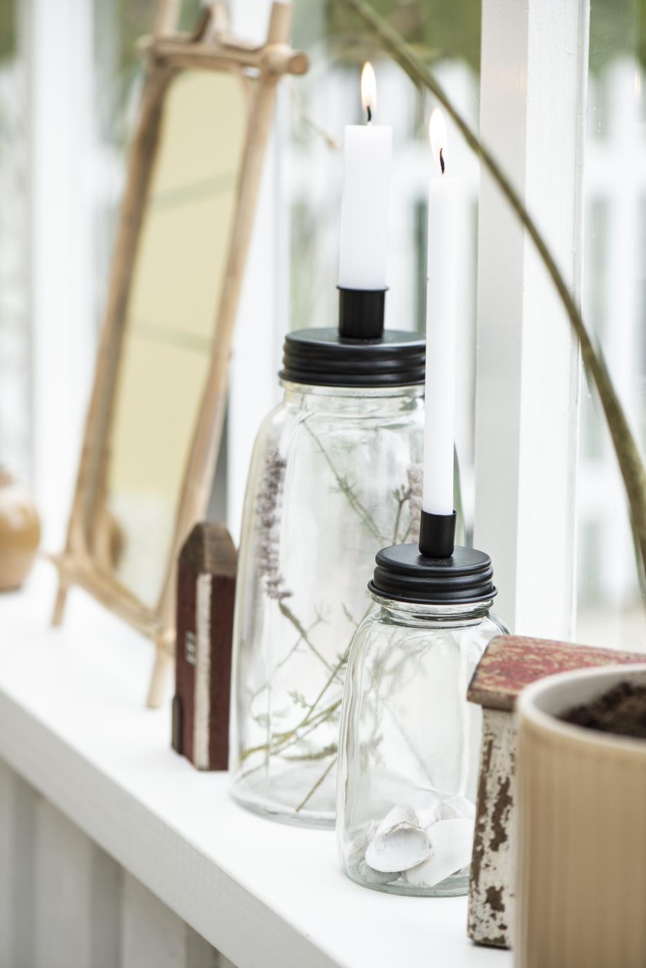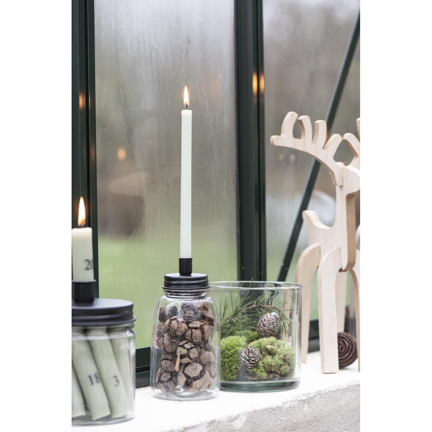 Portavela de vidrio alto transparente con tapa metálica color negro para sostener la vela.