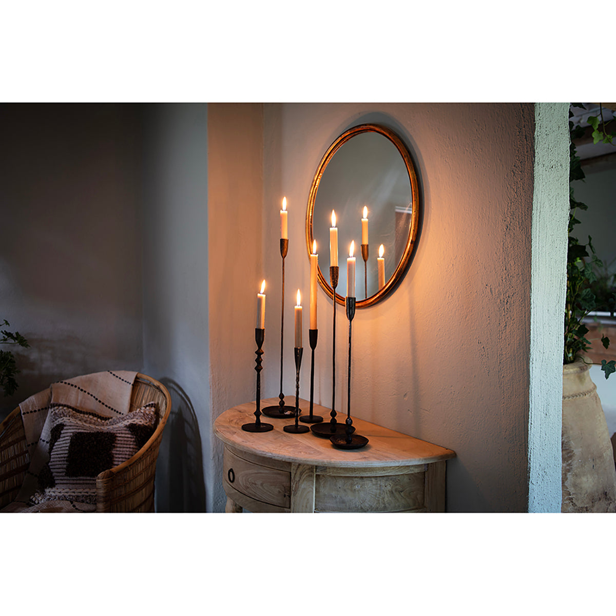 Actualiza la ambientación de tus espacios con este refinado portavelas negro de hierro forjado a mano. Su diseño versátil facilita la combinación con otros candelabros, ofreciendo una composición visual equilibrada mediante la variación de alturas. Las velas "dinner" de nuestra colección complementan perfectamente este portavelas y toda nuestra línea de candelabros.