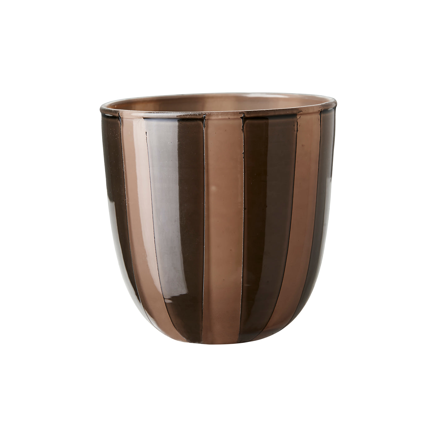 Portavelas pequeño de cristal con delicadas rayas en tonos beige y café, diseñado para velas tipo tea light. La luz que emite la vela se filtra suavemente a través de estas líneas, creando una iluminación cálida y acogedora que realza cualquier espacio.
